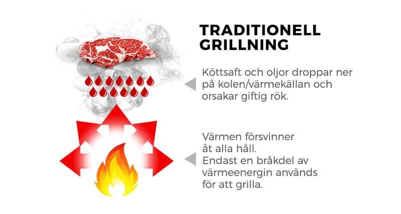 Vid traditionell grillning sprids värmeenergin åt alla håll. 90% försvinner till ingen nytta alls, bara hettar upp själva grillen och den omgivande luften. Bara en liten del används för att faktiskt grilla dina matvaror. Eftersom upphettningen av t.ex. kött är relativt långsam hinner inte köttets porer stänga tillräckligt snabbt. Köttsaft (och oljor) droppar ner på värmekällan och skapar rök och os.