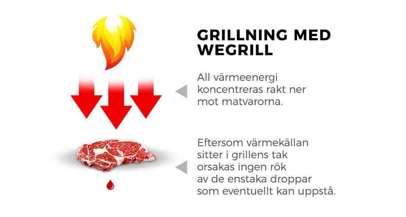 Med WeGrills gasoldrivna, infraröda teknik riktas värmestrålningen exakt dit den ska, mot grillgallret och din mat. Ingen värme försvinner.
